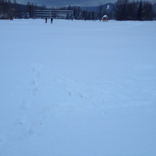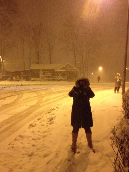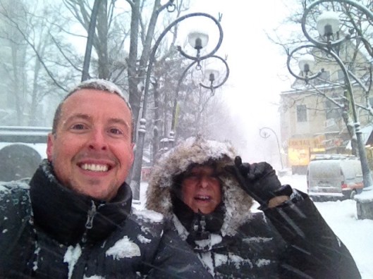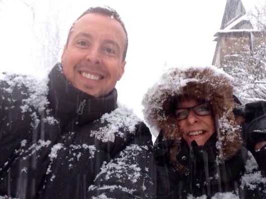 Scott and I them walked through the village on our way home and then found a park to cross. It was covered with powdered snow and ours were the only footprints across the park. We were really enjoying the experience. Although it looks really cold, when you have good coats and gloves, it isn’t that bad. Having to watch out for snow ploughs when you have limited visibility is a challenge though!