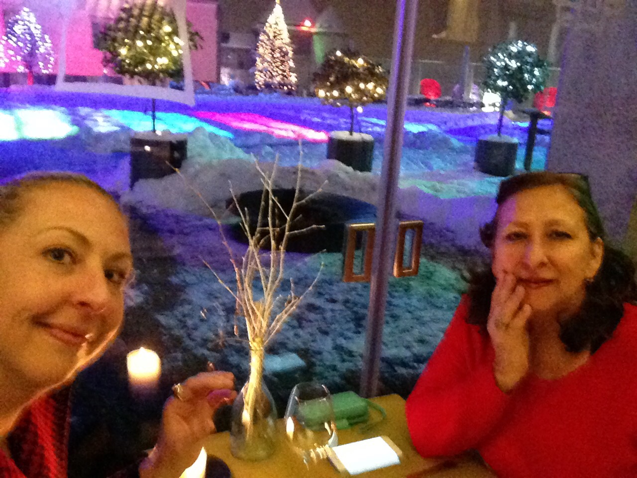 For dinner we shared 3 dishes, duck, Seabass and Klebasa with horseradish, all washed down with Schnapps. The grounds outside were lit with bright multicoloured lights that made the snow look even more magical.