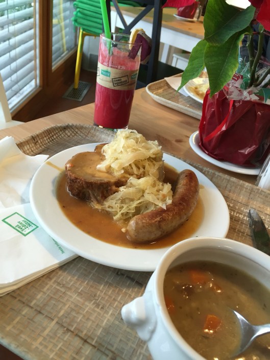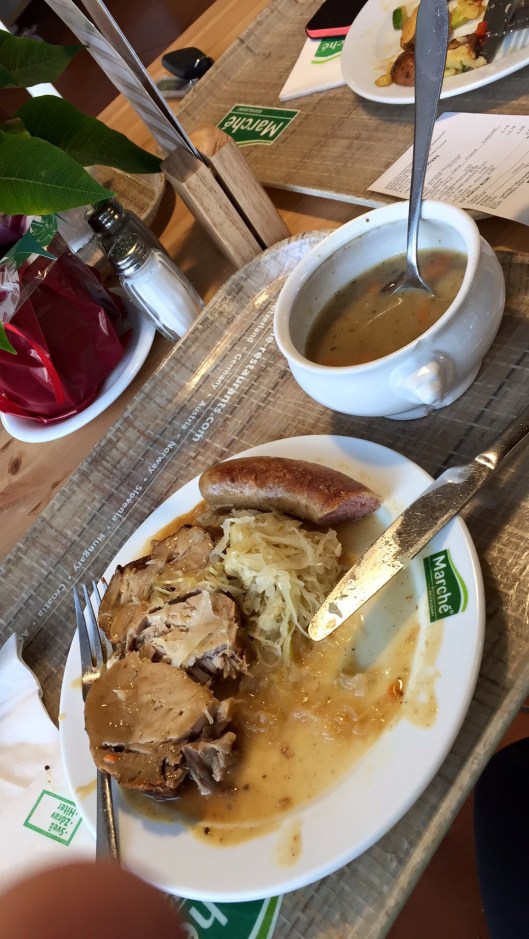 We stopped at a lovely roadhouse not far from Maribor in Slovenia and the food on offer was extremely fresh and healthy. These road houses are set up in a way that you just grab a plate and a tray and you serve yourself from a buffet-style arrangement. There is everything from soups, hot meats and stews, salad, sandwiches and desserts. A far cry from the fast food style service centres we have to eat at during road trips in Australia. We chose to dine on traditional Slovenian fare of sour soups and sausages and berry pie.