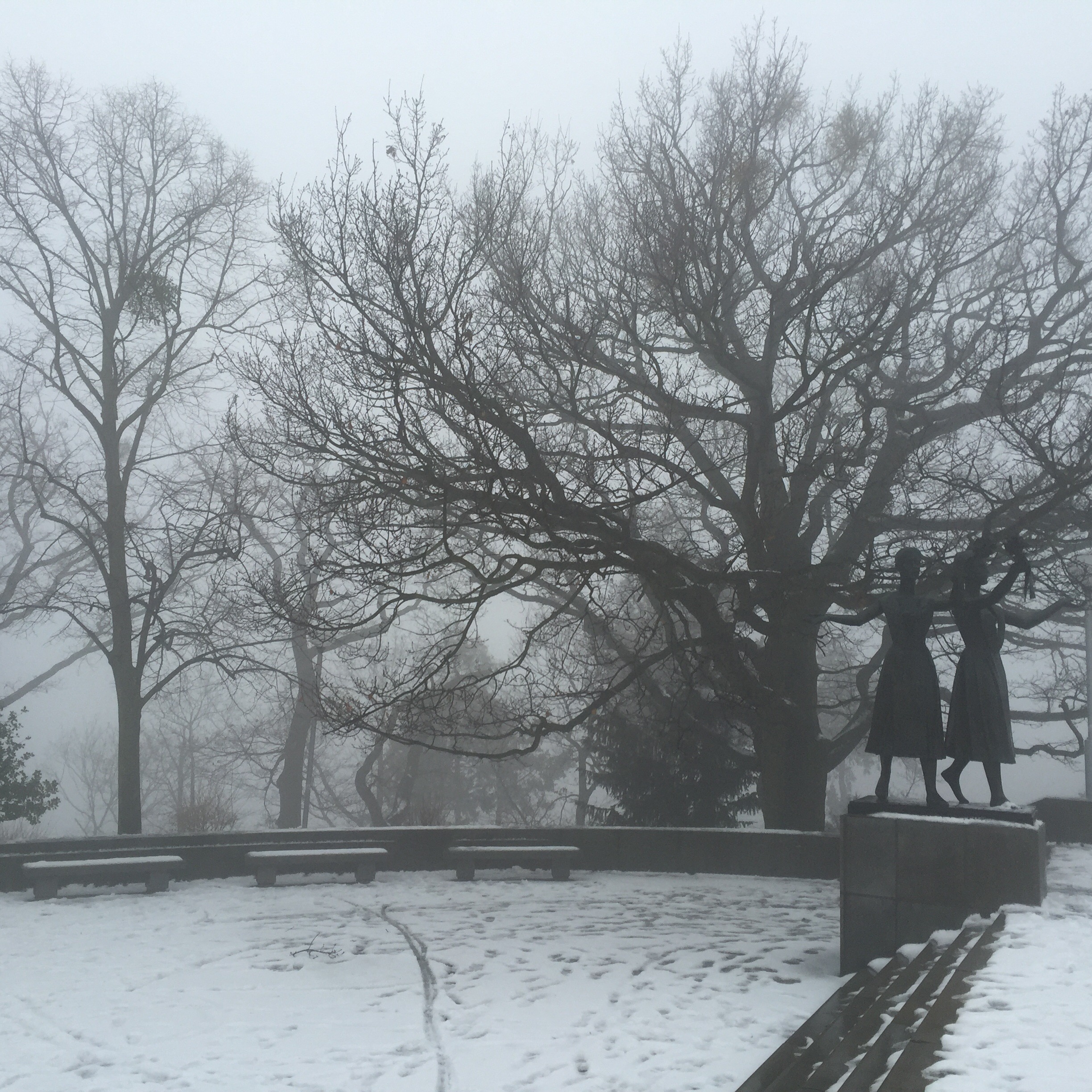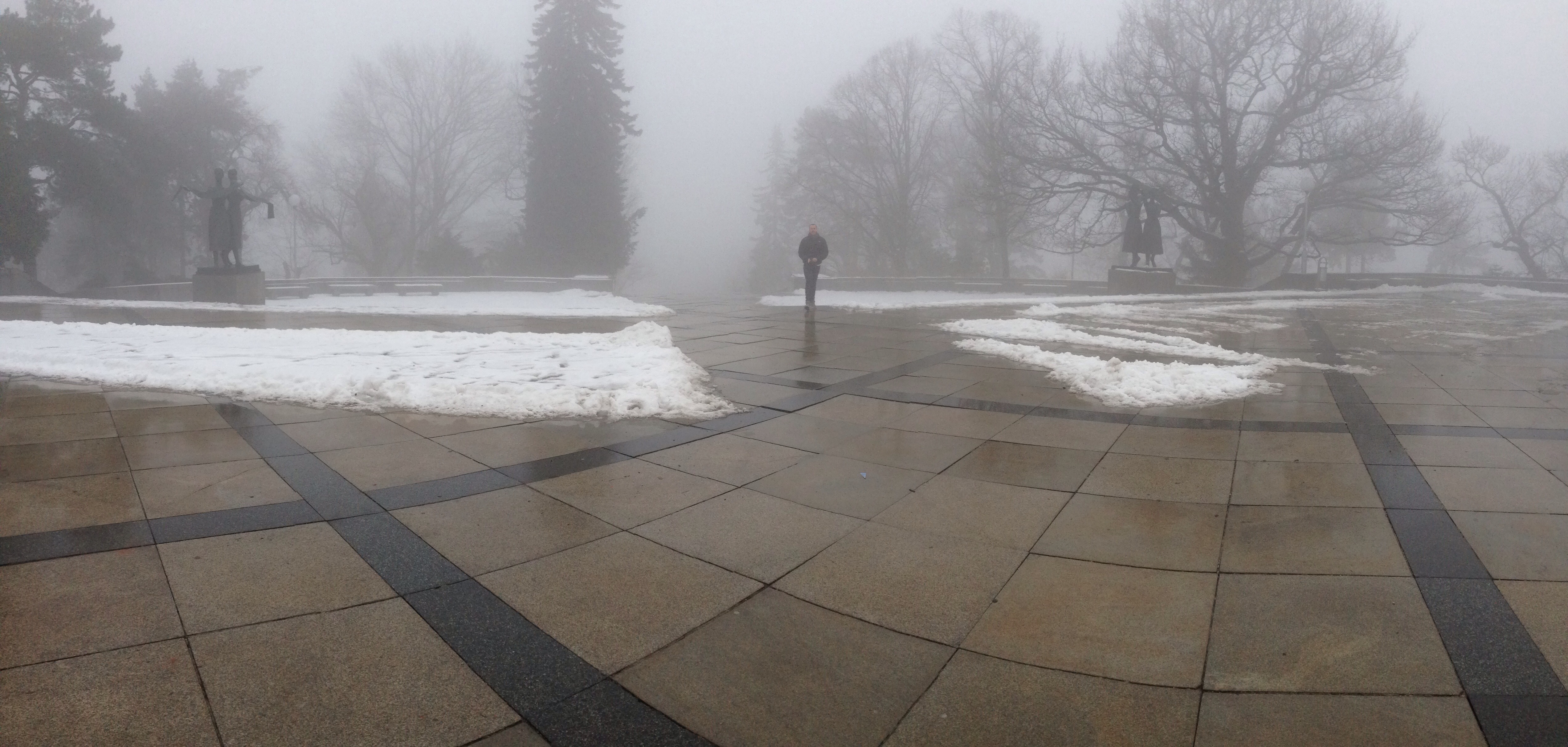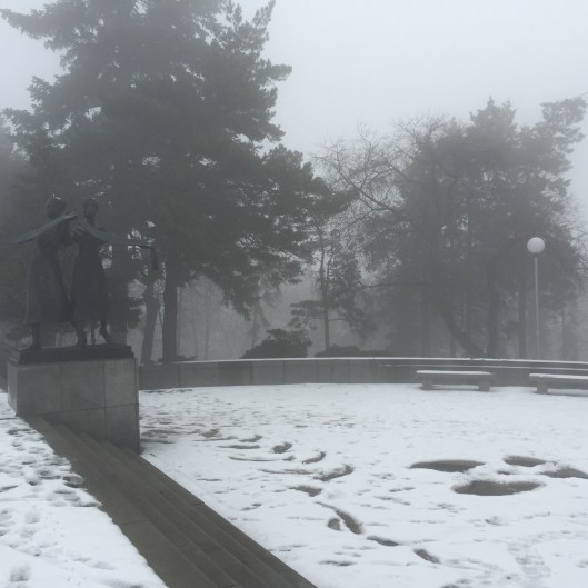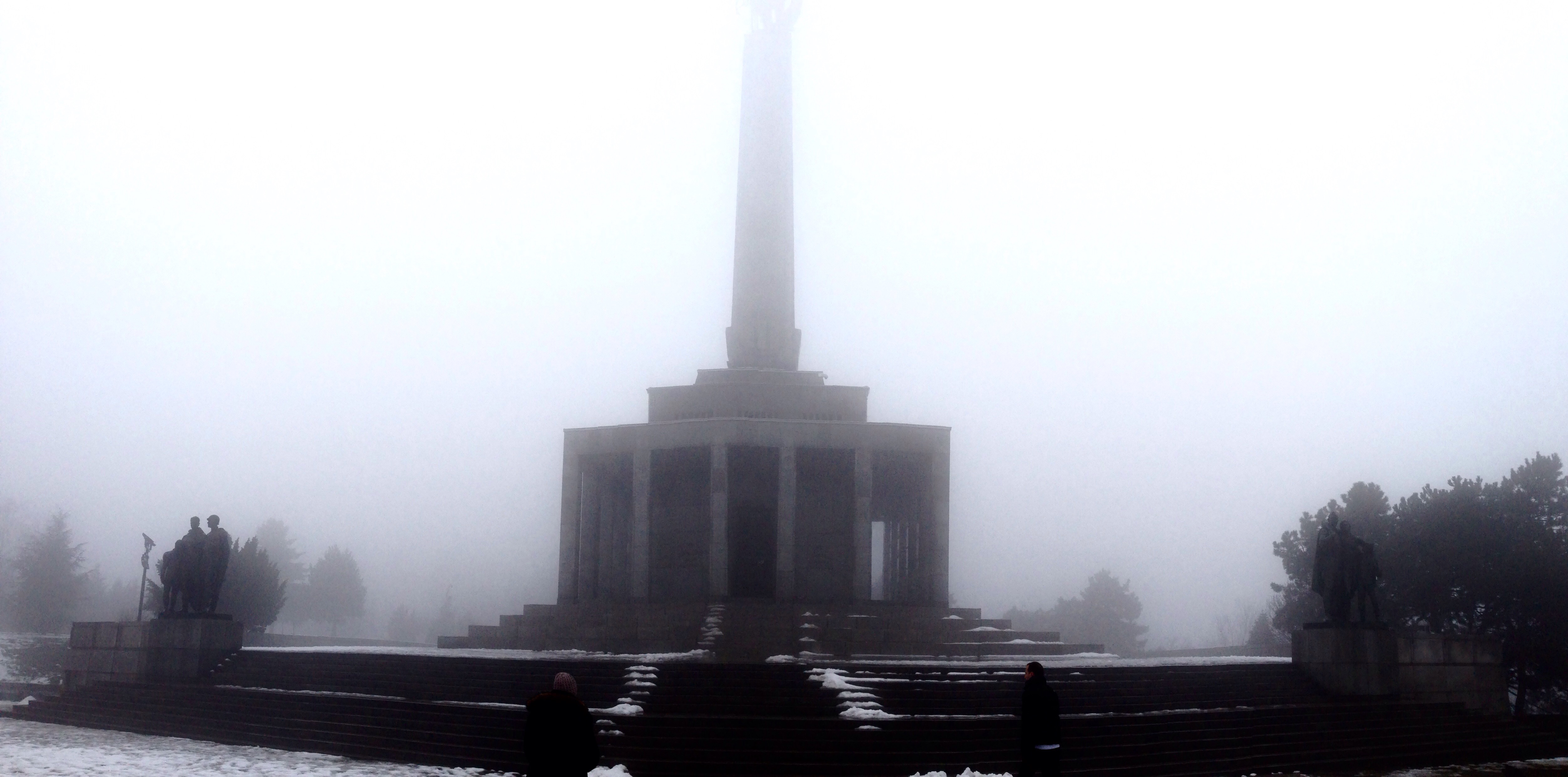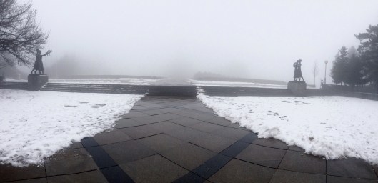 After this we walked downhill in search of the Danube. It was another misty day with frozen rain spitting down ever so slightly. On the way we spotted a flight of concrete stairs disappearing up a hillside. We decided that we needed to investigate. The stairs seemed to go on forever and after about 8 minutes we were at the top and in an area that Scott referred to as the “Vaucluse” of Bratislava. Nice big houses with luxury cars out front. A quick google maps search revealed that we were very close to the Slavin monument, a tribute to the fallen soldiers of World War II. We continued uphill and the monument slowly revealed itself. Again it was made so much more eerily beautiful in the fog as we took a walk around the grounds.