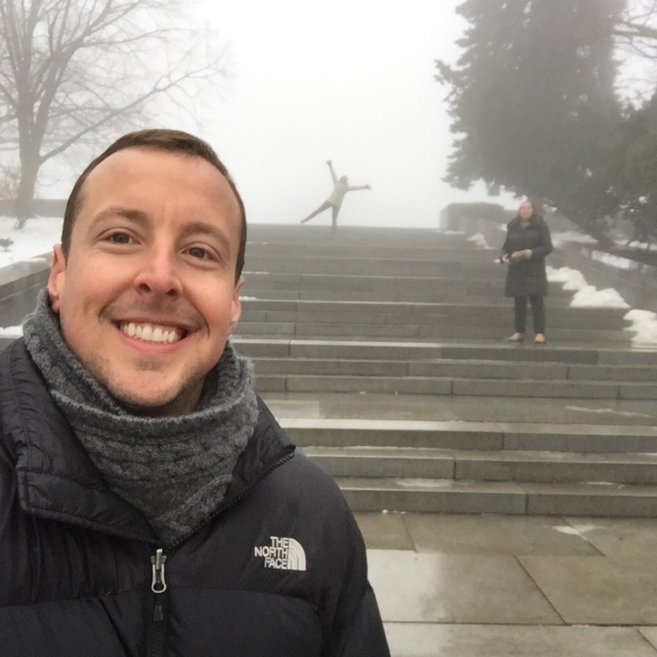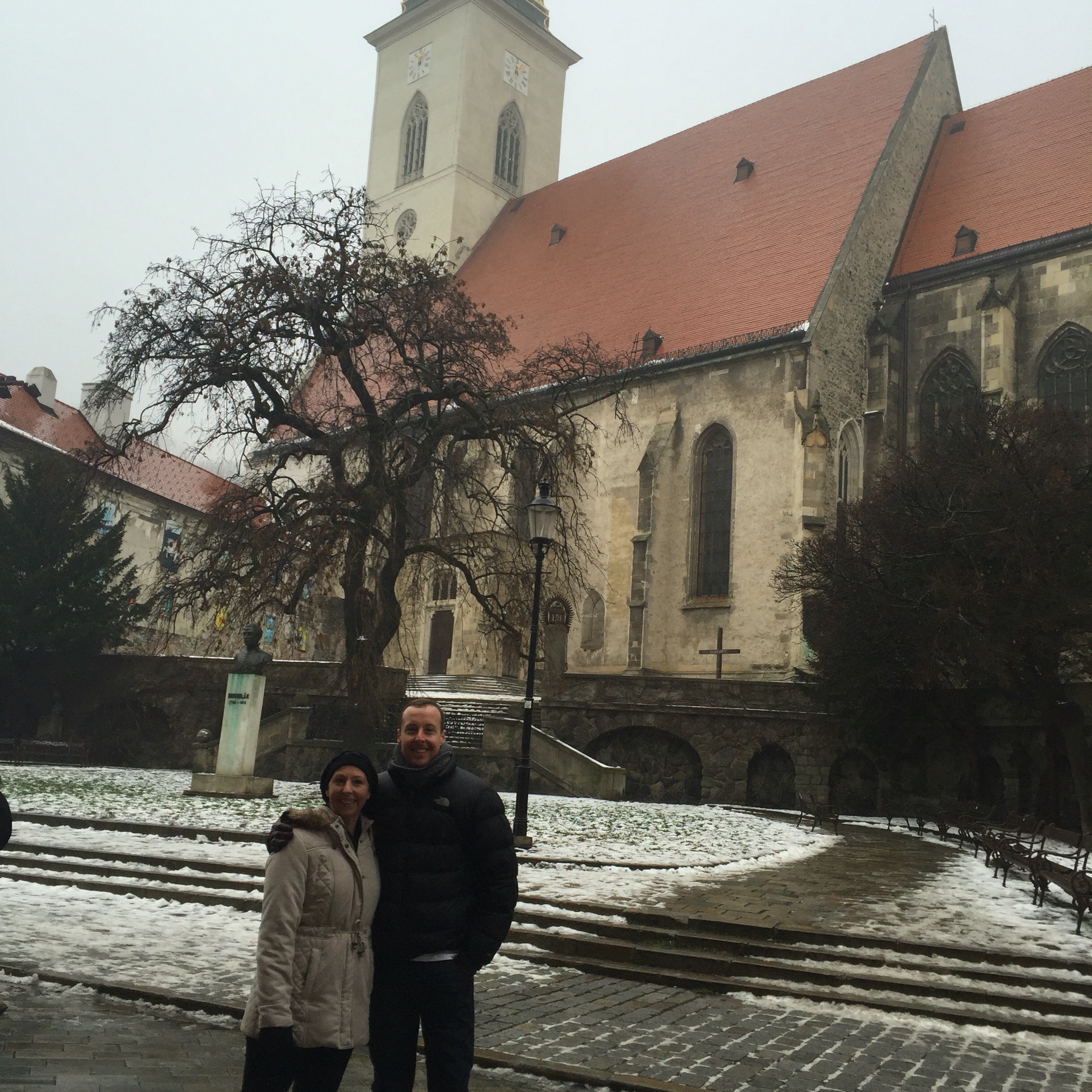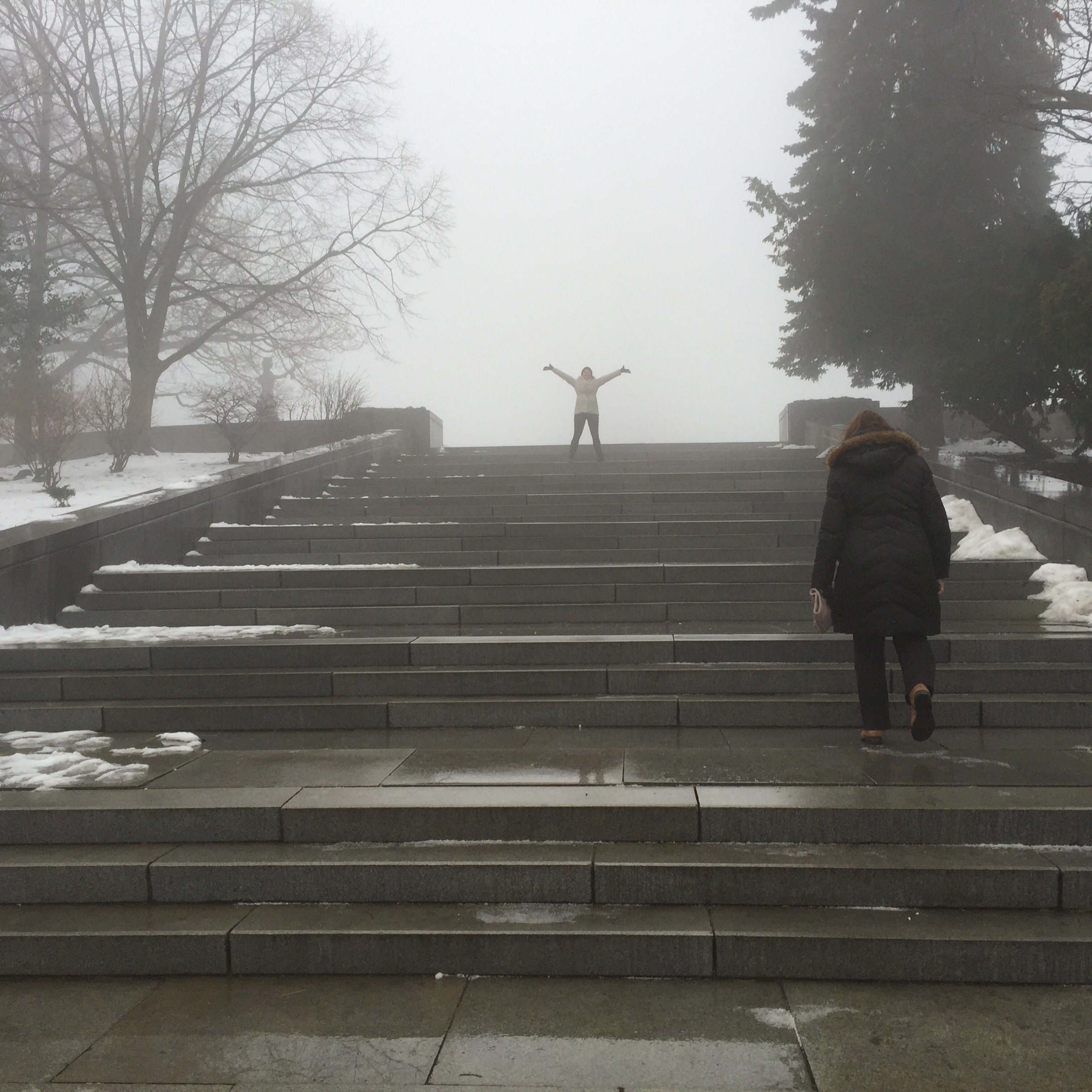 After this we walked downhill in search of the Danube. It was another misty day with frozen rain spitting down ever so slightly. On the way we spotted a flight of concrete stairs disappearing up a hillside. We decided that we needed to investigate. The stairs seemed to go on forever and after about 8 minutes we were at the top and in an area that Scott referred to as the “Vaucluse” of Bratislava. Nice big houses with luxury cars out front. A quick google maps search revealed that we were very close to the Slavin monument, a tribute to the fallen soldiers of World War II. We continued uphill and the monument slowly revealed itself. Again it was made so much more eerily beautiful in the fog as we took a walk around the grounds.