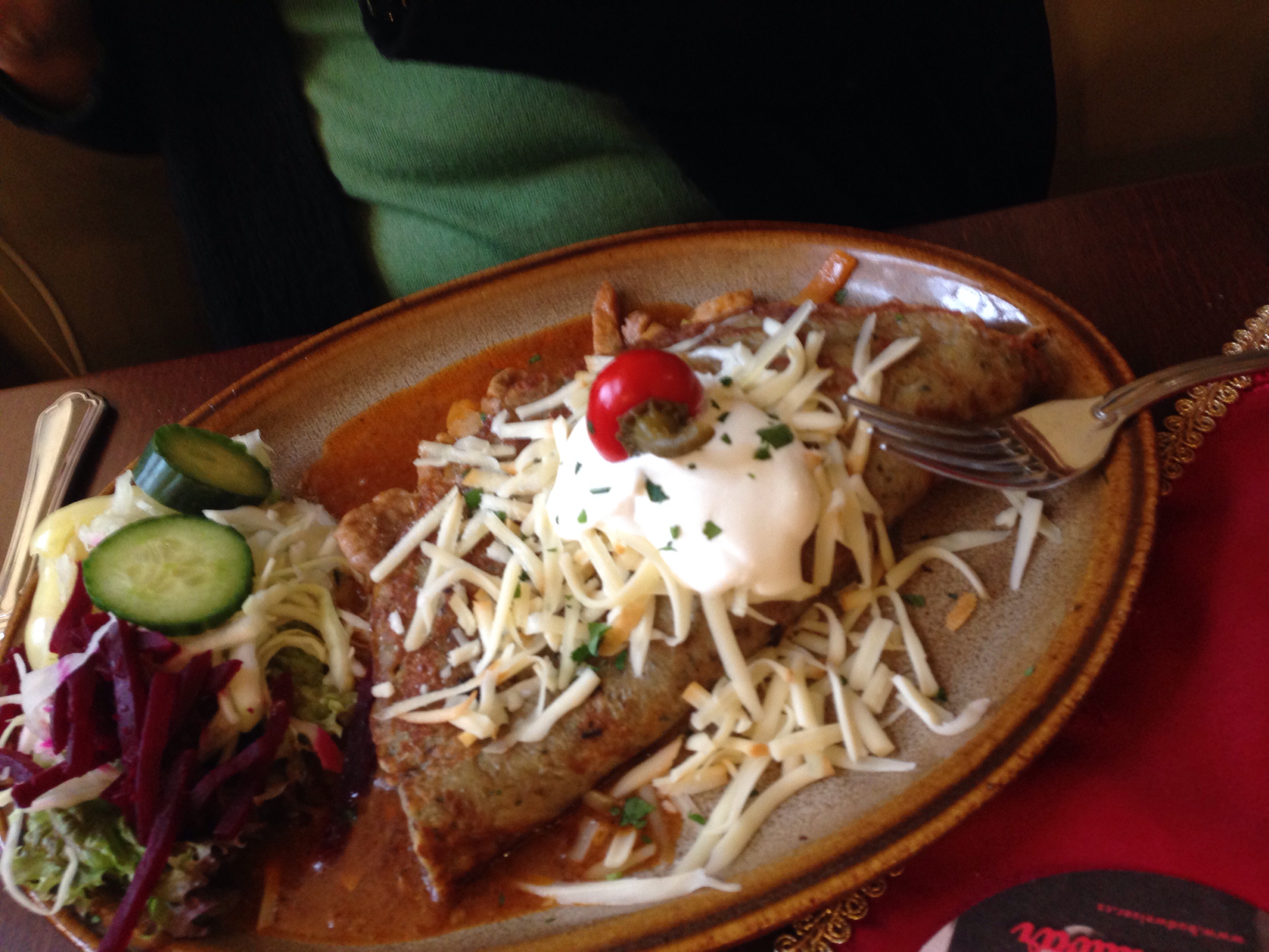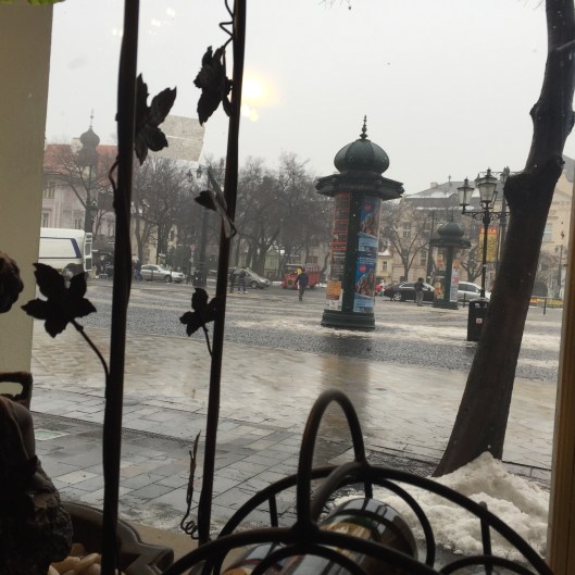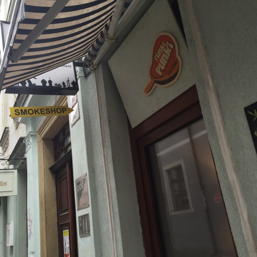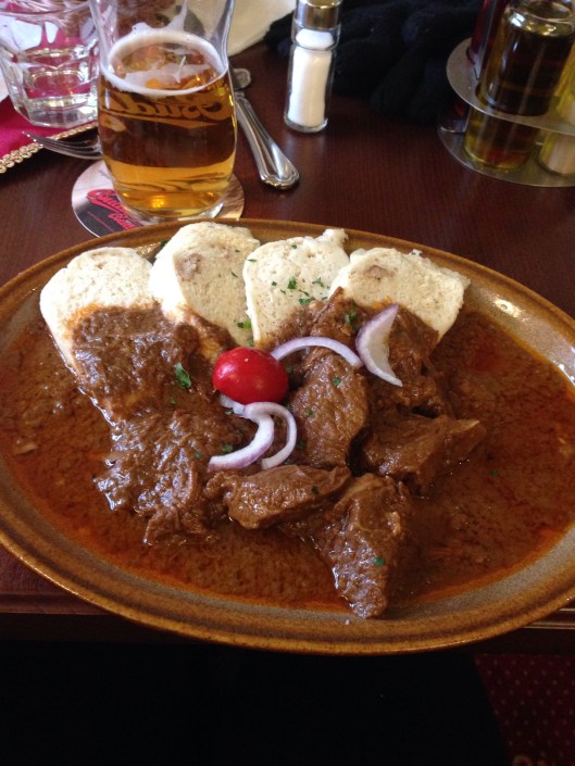 We had decided to follow Scott to Vienna instead of spending another night in Bratislava. Scott will fly out and Teresa has found some reasonably-priced accommodation near the river for her and Michele. We found the Danube and the ticket office but sadly found out that it was closed and due to the time of year it seemed that no ferries travelled on the weekend. We would have to take a train instead. Lunch was eaten in another Slovak restaurant. Scott had a traditional creamy garlic soup served in a cob, followed by smoked meat dumplings, Michele finally found the goulash she had been hanging out for and Teresa had a delicious potato pancake filled with roast pork and cabbage.