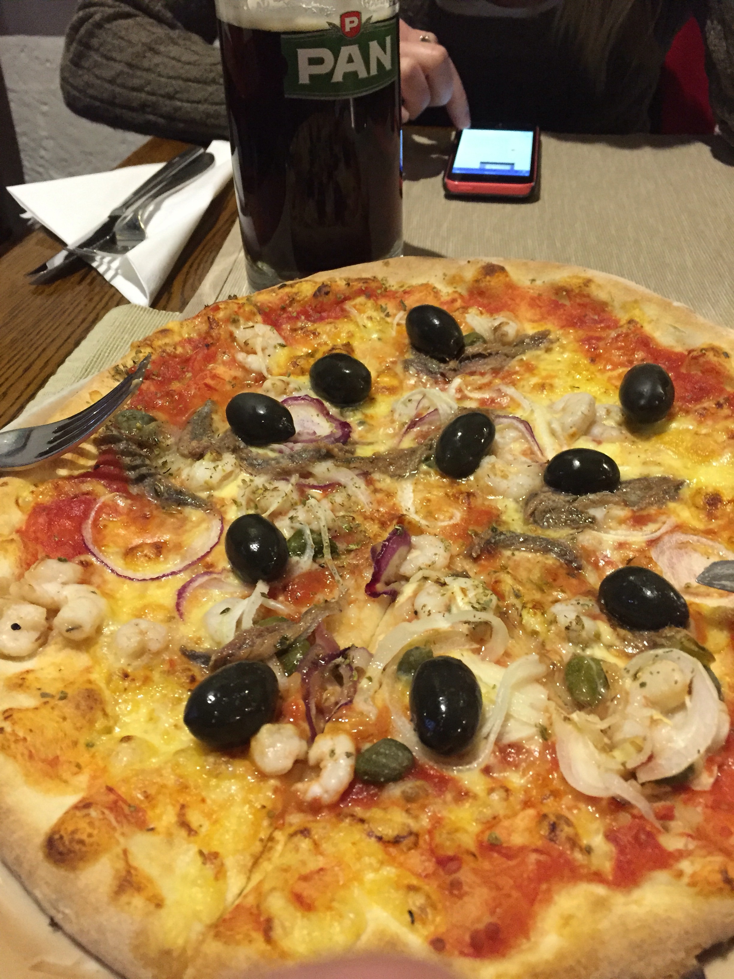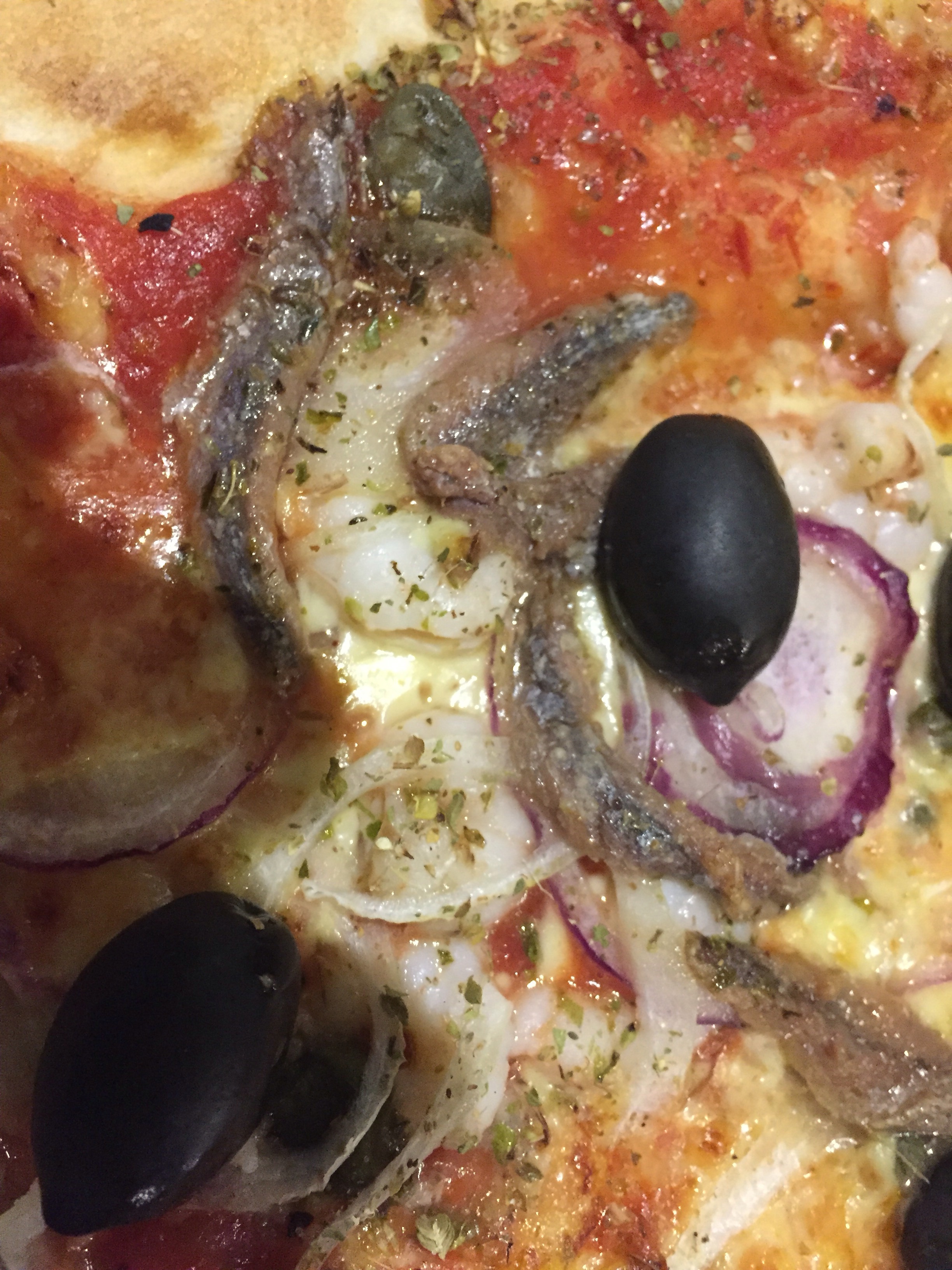 We did some souvenir shopping before returning to the pizza restaurant for some lunch. Teresa finally had an authentic pizza covered with anchovies! Yum!