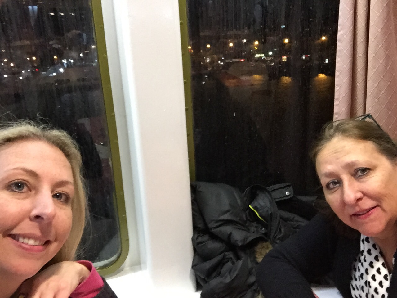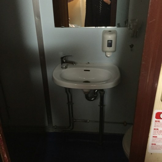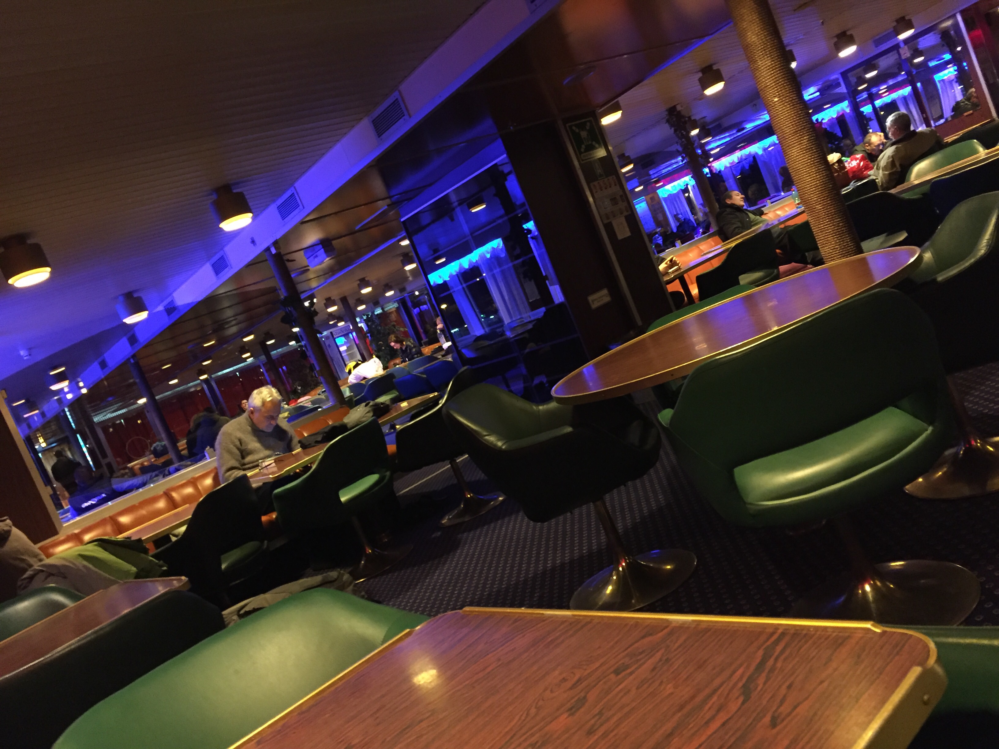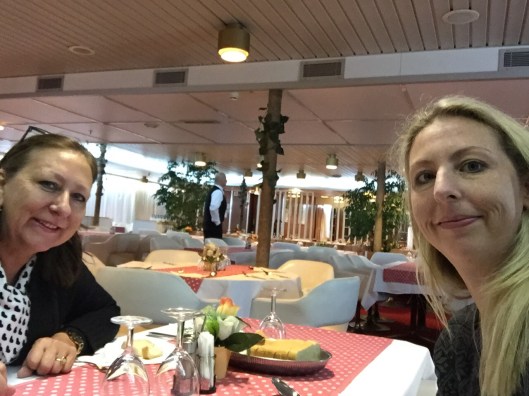 Once settled in our cabin we went for a tour and were nearly blown off the outside deck by a very icy wind. So we found the restaurant where all the waiters were waiting for us.