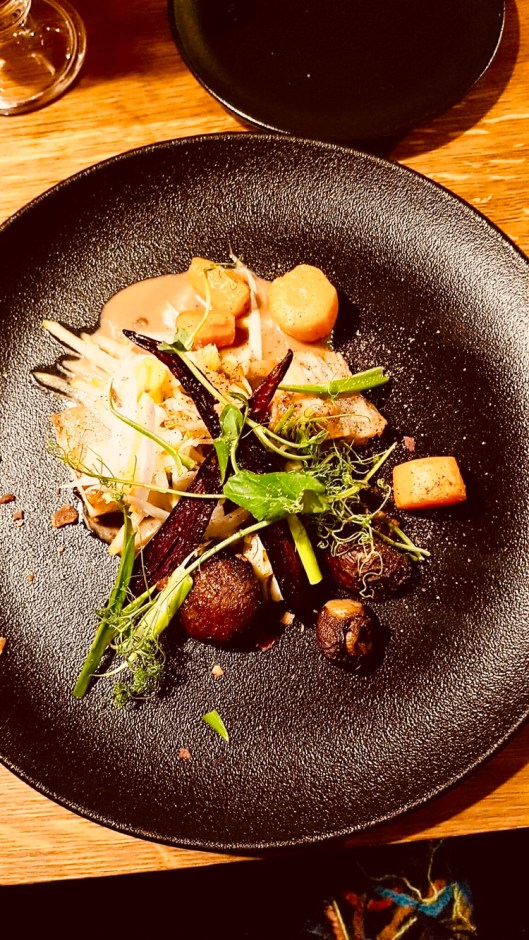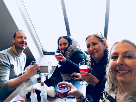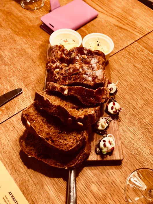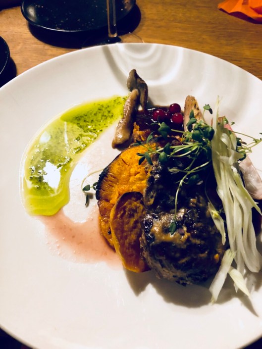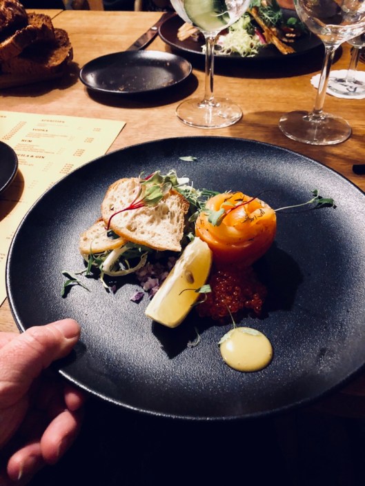 For entree Scott and Michele had salted salmon and Teresa had fried herring fillets. Main course was lamb rump, again for Michele and Scott, braised elk roast for Teresa and slow cooked pork belly for Irene. We also had the most amazing complimentary bread and butter for the table. Drinks were mulled wine, gin & tonic, and… of course, vodka.