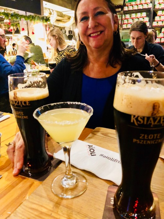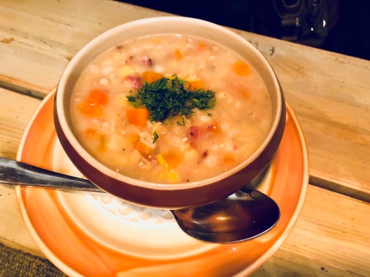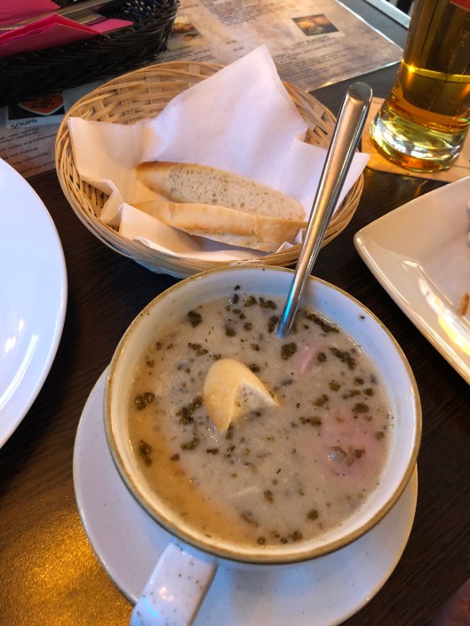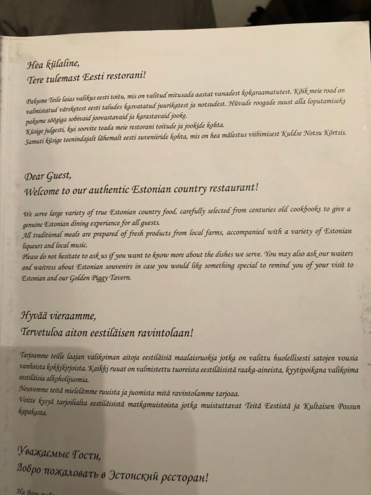 We found the Golden Piglet, a quirky little restaurant in the old town serving traditional Estonian cuisine. We started off by ordering crispy pigs ear with garlic sauce for the table and some soup: Michele had a sauerkraut and pork soup, Irene had creamy pea soup with smoked pork, and Scott had pumpkin and vegetable soup with smoked cheese….a clear winner. For main course Teresa had an amazing crispy pork shank with mustard and Scott had pork roast with sauerkraut. We washed down lunch with Estonian beer, pepper vodka and local liqueur called vana. Irene and Scott also tried a traditional dessert drink called Kama, which is a milled flour blend (a bit like a really smooth porridge) served with berries.