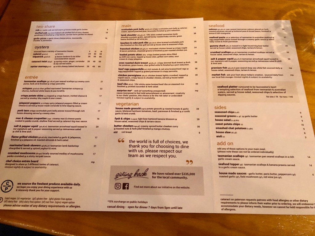 After the cruise we sought out lunch and went with a recommendation from a friend (thank you Sensay Sue!) and dined at Hallams Seafood. We shared Kilpatrick oysters (surprise surprise!), battered local fish & chips, and a truffle & pecorino pasta dish. Delicious! We can totally understand the attraction of living in Tasmania. The emphasis on green energy, the fresh air and clean living, with top quality produce leaves nothing else to be desired.