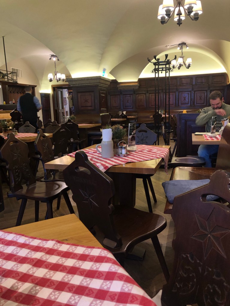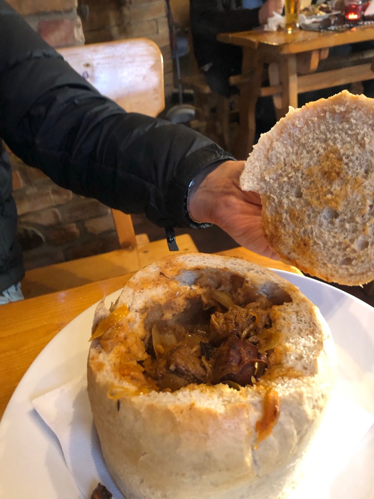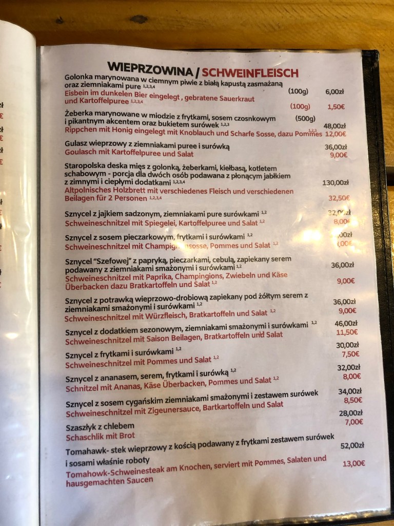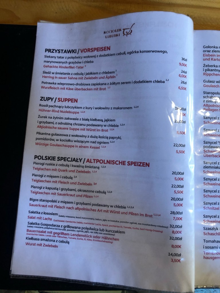 The restaurant looked like the inside of a timber cabin and was fully decked out with timber furniture. When the Polish waitress approached us, Scott enquired about her choice of language – English or German … she preferred German. The menu was also in Polish and German. We ordered a Zurek soup each which were served in a cob rye bread loaf and packed full of Polish sausages and half a boiled egg. The soup can be described as a fermented rye sour soup. It was the best!!!!!!