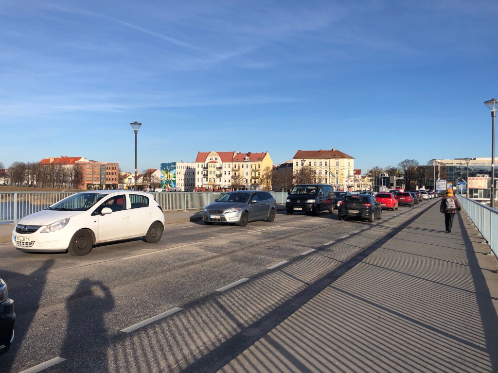 You can walk (or drive) across this bridge and then you are leaving Germany and entering Poland. This is the first time I have walked between countries. There were many cars queued up in both directions, some being stopped and searched by people with Hi Vis vests that said ‘Zoll’ on them. They were choosing random cars that were crossing the border from Poland to Germany and thoroughly checking out all areas in the car and boot. Once across the bridge we headed to the right along a raised footpath. It looked like it was designed to deal with the flood plain if the river ever flooded.