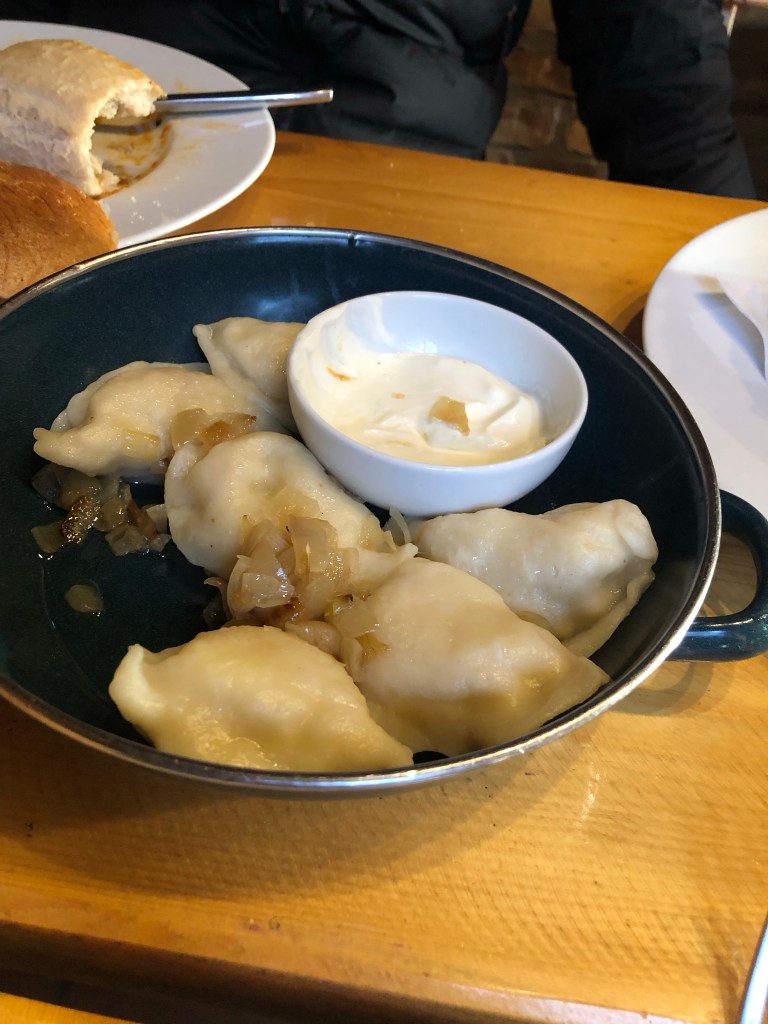 After the soup we ordered Bigos (cabbage fried with polish meats) which also came in a bread cob and the Ruski Pierogi – cheese and potato filled dumplings. The pierogi were ok but we agreed that our homemade ones are better. There were many patrons here for a meal. We enjoyed a Zywiec beer each with our meal.