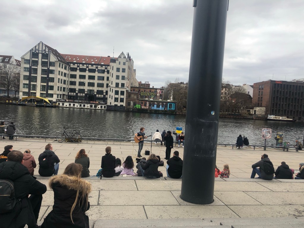 The Brandenburg Tor train station has an exit near the Russian embassy. It is an imposing building with many people congregating outside. One young man was seen to be doing the one finger salute into the air to express his opinion of the embassy. A tribute to Ukraine has also been set up on the land strip in the middle of Unter den Linden Strasse (Grand boulevard lined with Linden trees), attracting much interest.