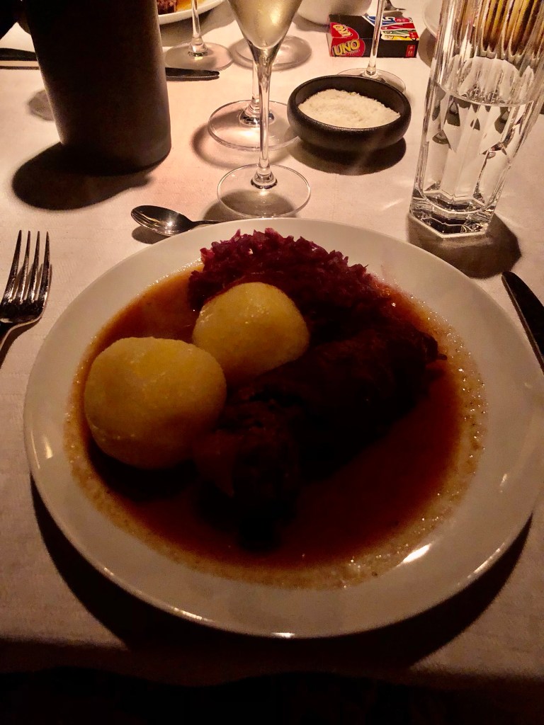 We wanted to see if we could get a meal here but they were only accepting reservations. So further down the road we found the Lebensart restaurant and sat inside. It was busy but the wait staff were efficient and friendly. I chose the Currywurst which was served with chips and Scott ordered the Club Sandwich. Chosen beverages were beer and gluwein. An Apple strudel was also consumed.