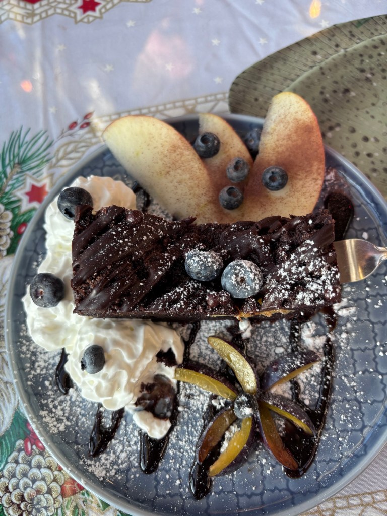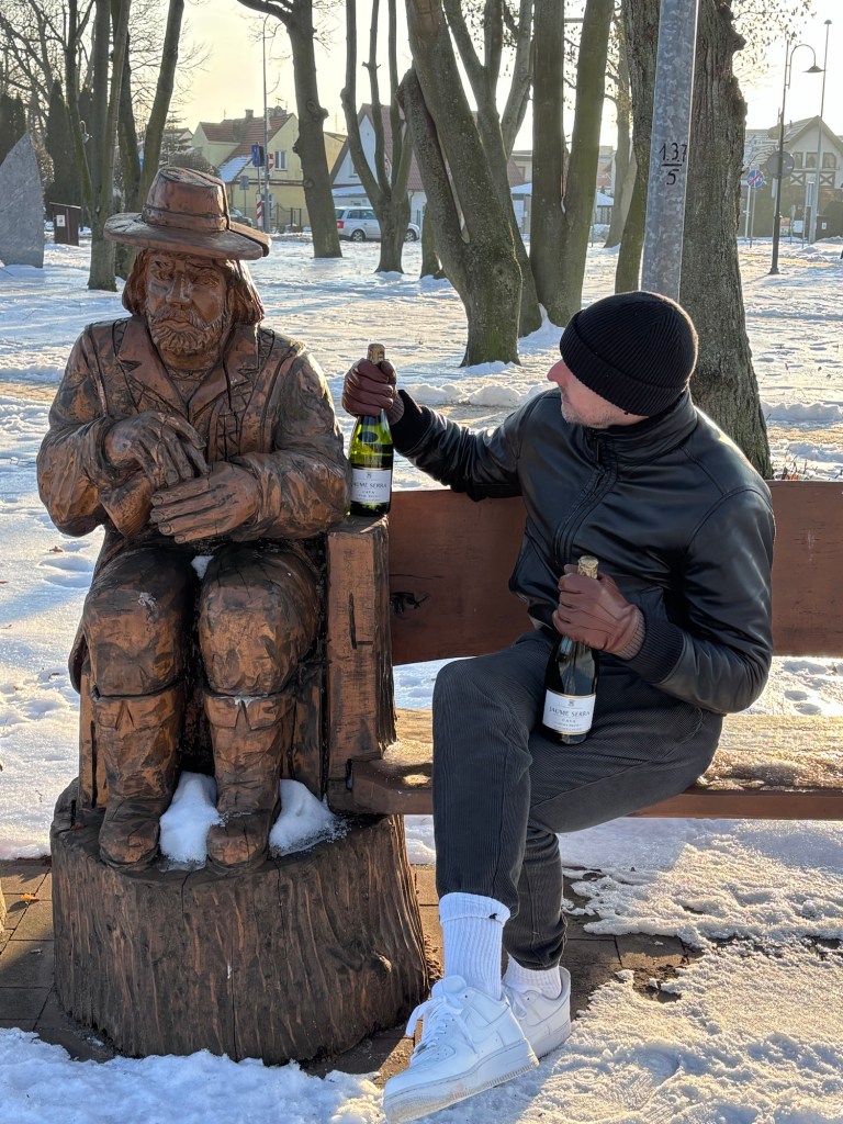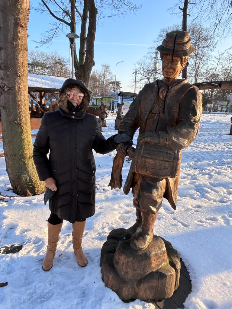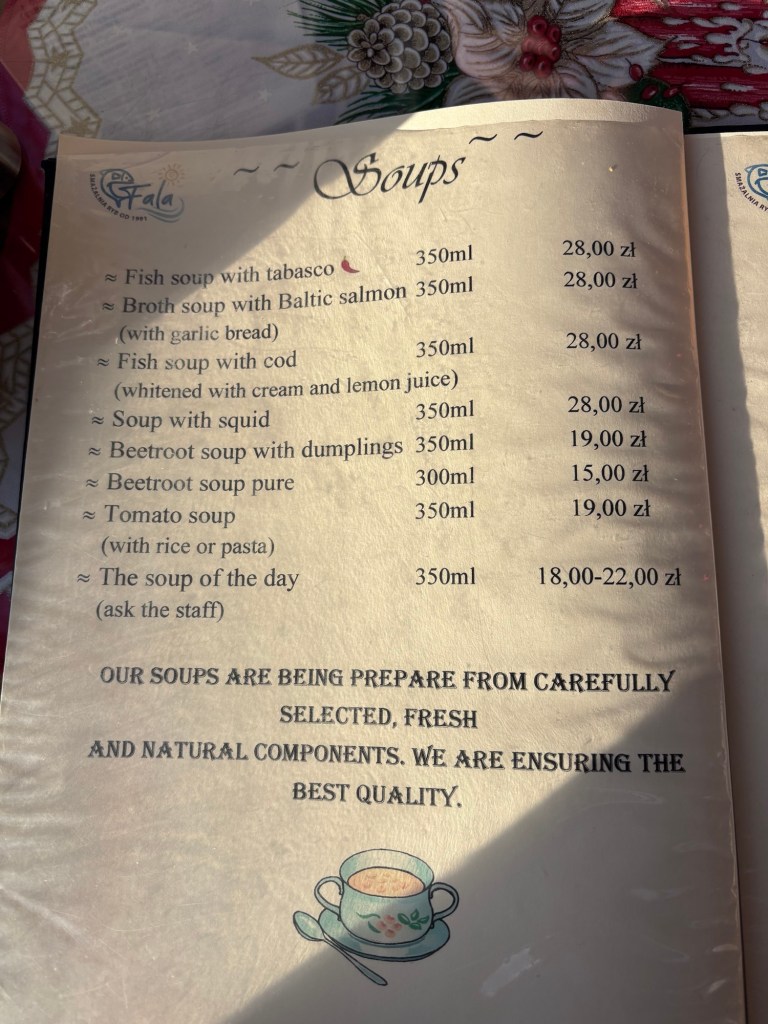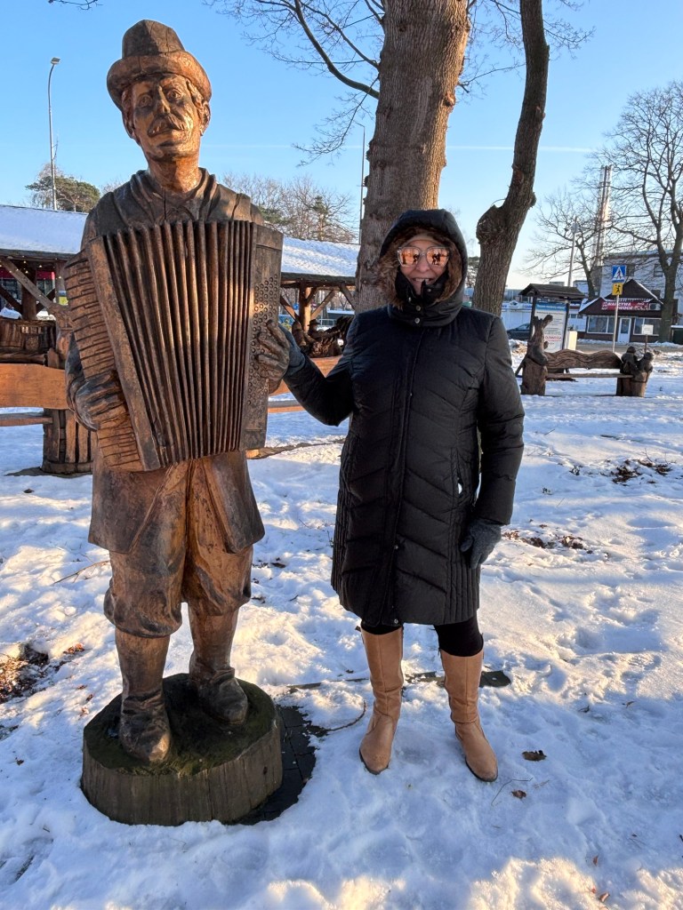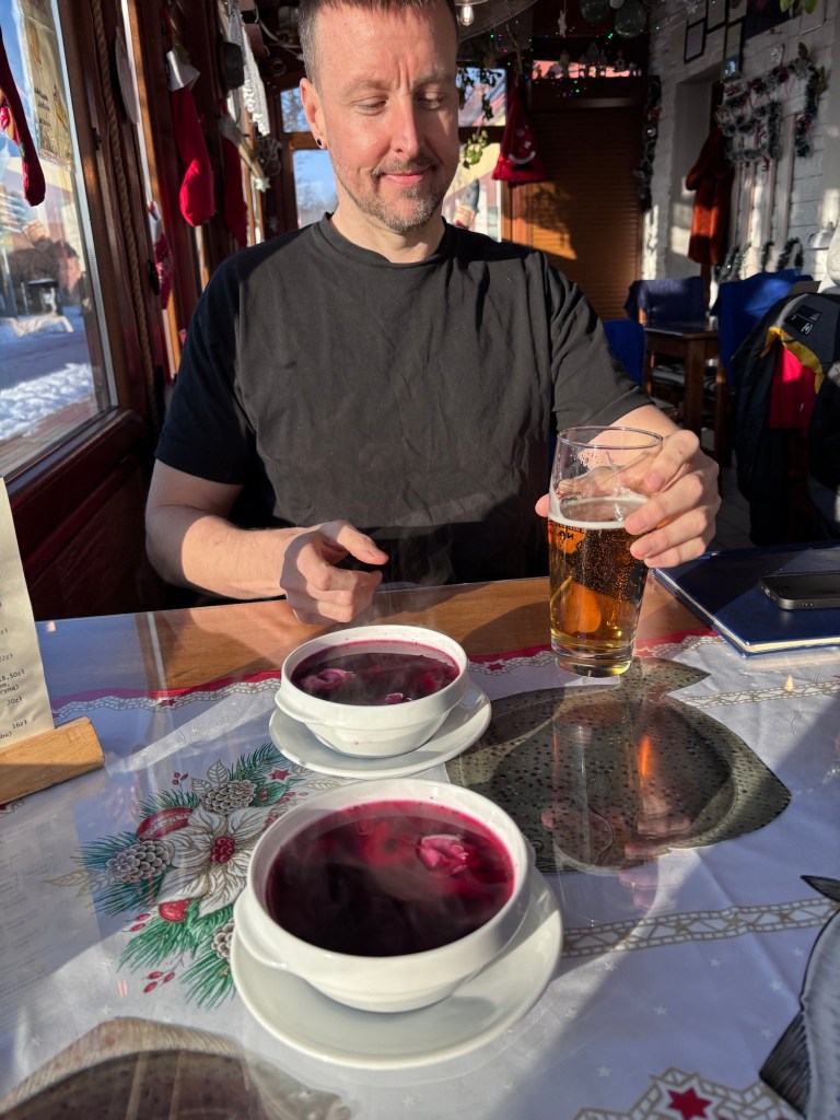 We admired the view before seeking warmth and some lunch. The Fala restaurant was just across the icy road so we settled in. We enjoyed Borsch soup,  Flounder and fried potatoes and then a Pierniki gingerbread cake that was so moist and boozy, it was a hit!