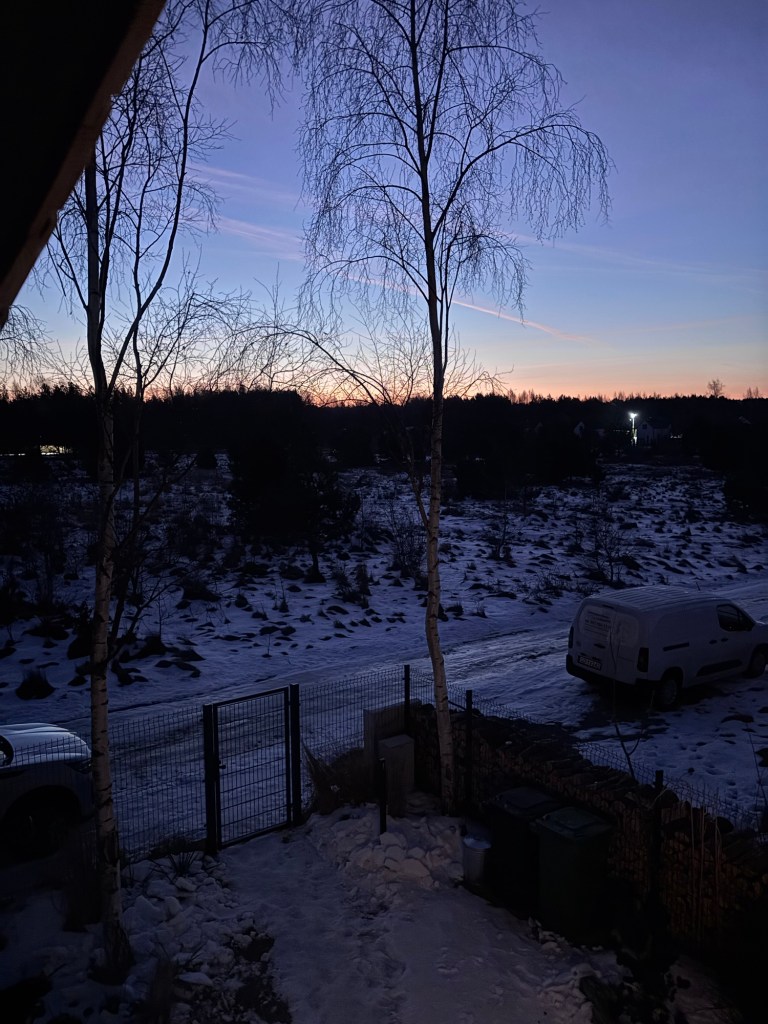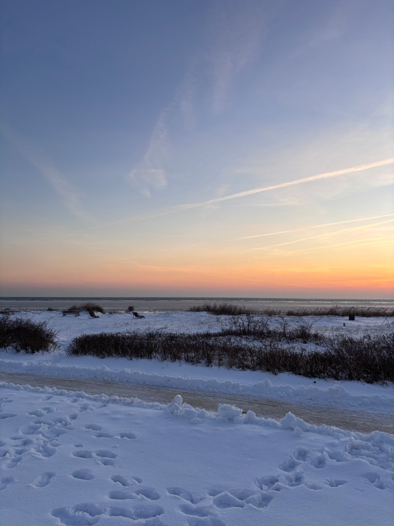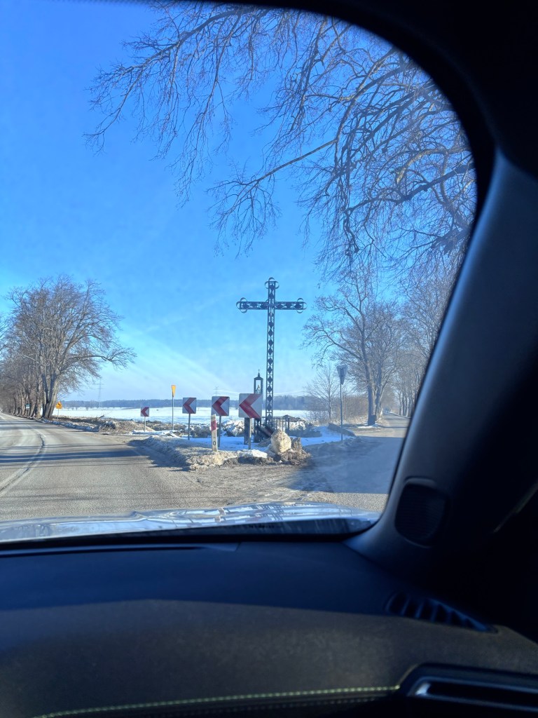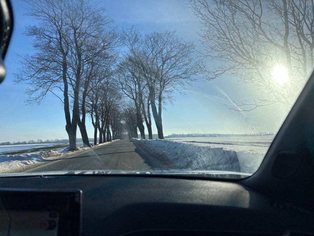 I needed my sunglasses today as we drove past cold white fields covered in snow. The roads were lined with trees devoid of leaves and snow was cleared to the sides of the streets and foot paths.