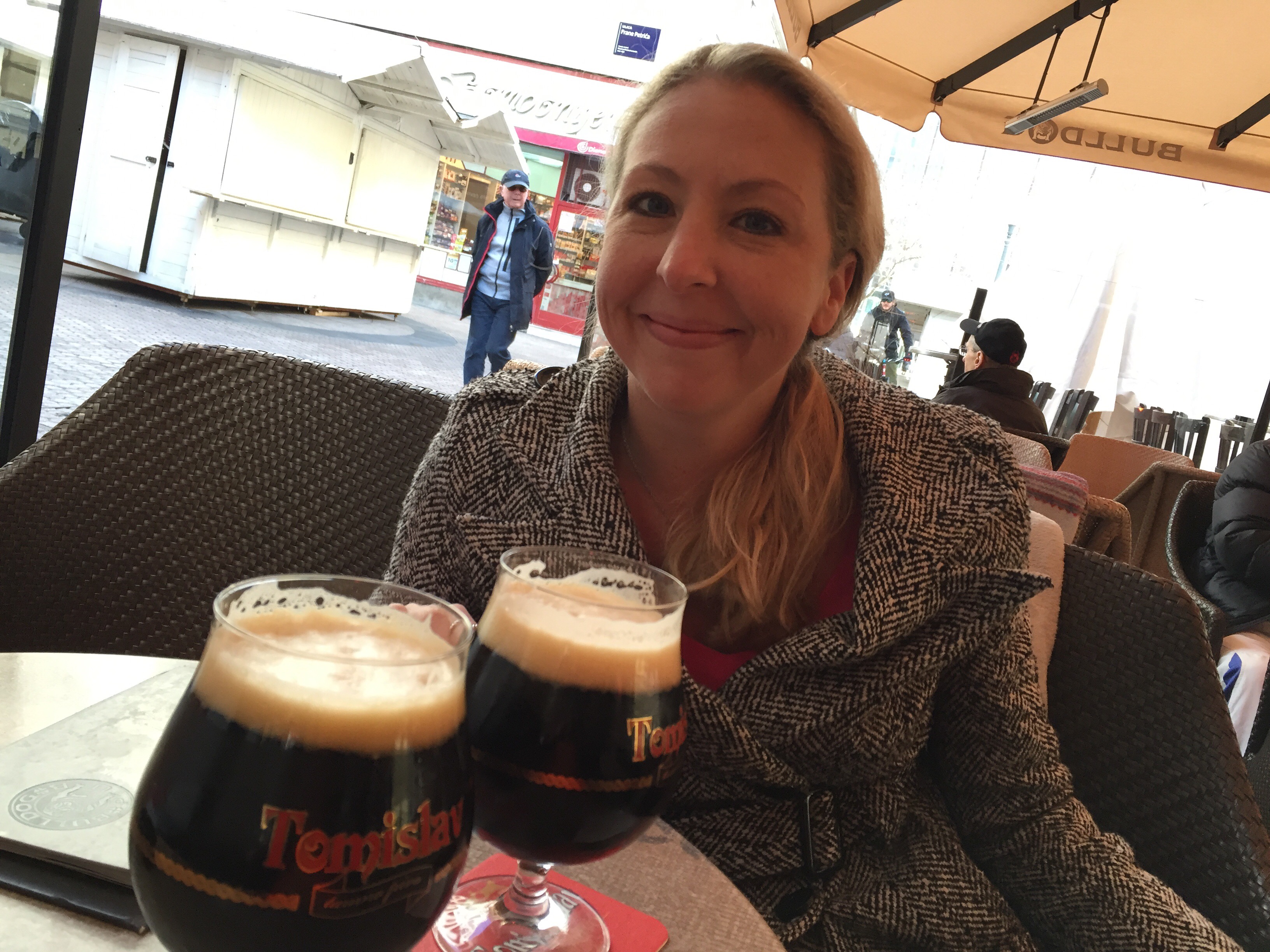 Because so many restaurants are closed in Split at this time of year, Irene walked us through the palace grounds to a typical Split restaurant where we parted ways with her and finally sat down to eat! We shared as bruschetta followed by a pizza and, of course, beer!