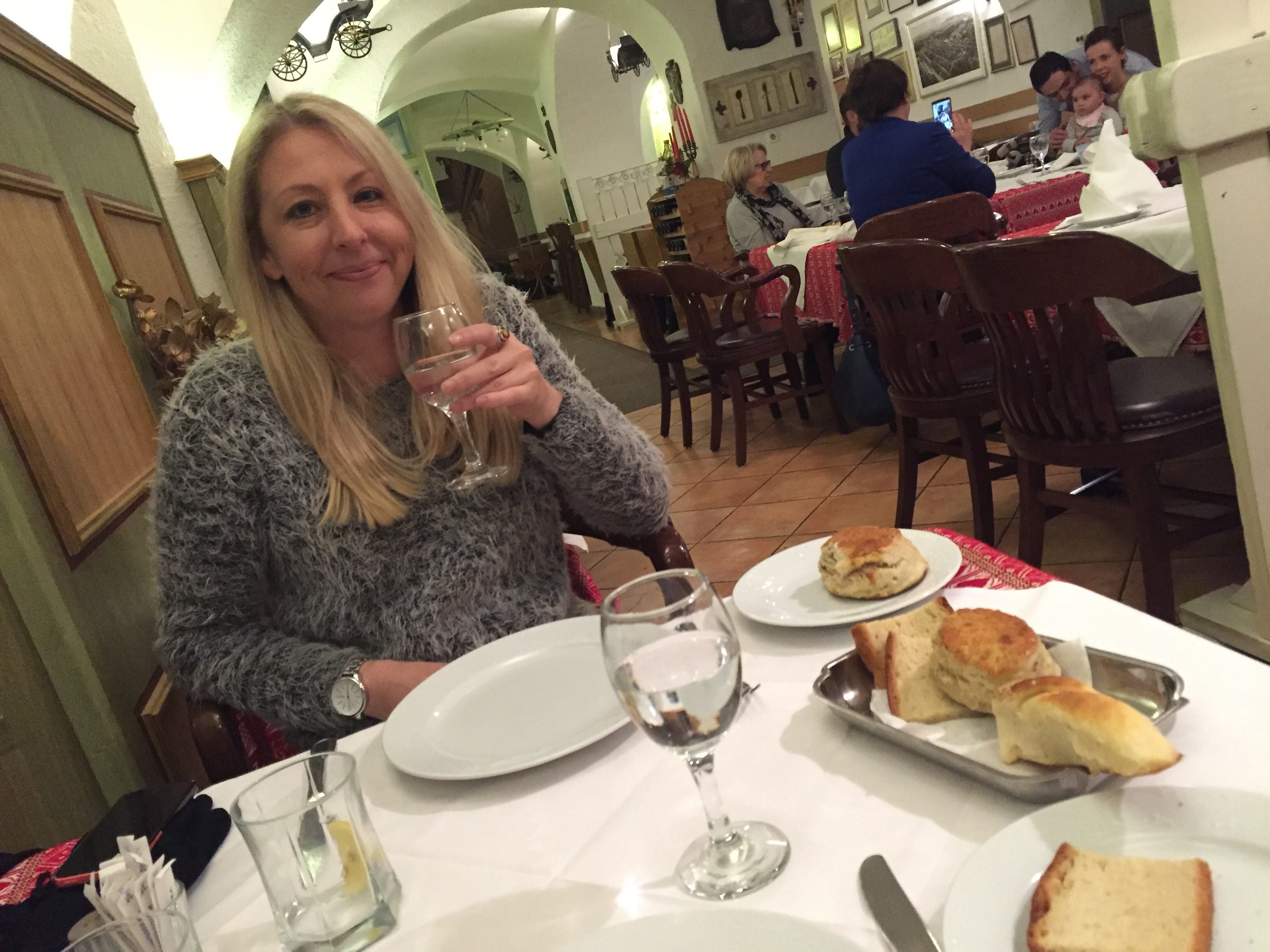 Once settled in our cabin we went for a tour and were nearly blown off the outside deck by a very icy wind. So we found the restaurant where all the waiters were waiting for us.